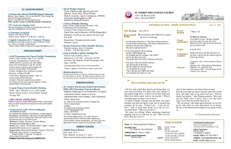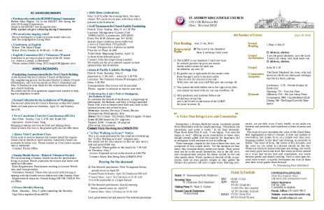 St. Andrew Kim Catholic Church is located in Olney, Maryland, a northern suburb of Washington D.C., the capital of the United States. St. Andrew Kim Dae-Geon, the first Korean priest and martyr, is the patron saint of the church. In October 1965, Korean catholic residents and students in D.C. area gathered at The National Shrine of The Immaculate Conception for the first time. Then the church community was formally established in 1974 and moved to College Park, MD in 1981. On November 17, 2002, the church was moved to a beautiful new church that was built in Olney, Maryland. St. Andrew Kim Catholic Church has been the place of the spiritual and social life of the Korean catholic as well as Korean community in the Greater Washington metropolitan area for the last 30 years.